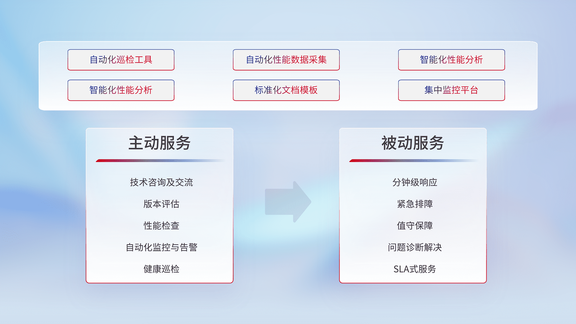 智能化工具和标准化文档,,,保障服务质量,,提供主动服务(包含技术咨询、、、版本评估、、、、性能检查、、自动化监控与告警、、健康巡检)和被动服务包含(分钟级响应、、、紧急排障、、、值守保障、、问题诊断解决、、、、SLA服务)。。